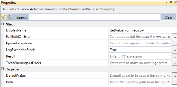 This post is all about option 5), to read values stored in the registry from your own build definition templates, you can use an activity that I’ve just committed to the Community TFS Build Extensions. The activity is called GetValueFromRegistry